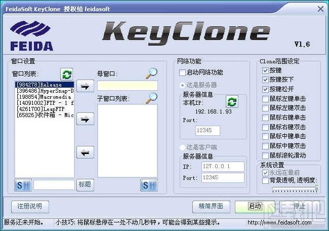KeyClone(强大游戏多开工具游戏多开器),游戏的好帮手。允许你同时操作多个角色同时进行游戏,可以让你控制的角色们同时进行各种动作,比如喝药、buff、物理攻击、魔法攻击、挖矿等等;想象一下你控制的一队人同时攻击一个目标的情景:秒杀!支持多种游戏比如:魔兽窗口化,魔剑窗口化等等支持网络,允许你同时控制别的机器上的程序。网络安全组提供的是新版本,允许定制需要Clone按键的范围和禁止Clone的按键范围。支持Vista和Windows7等